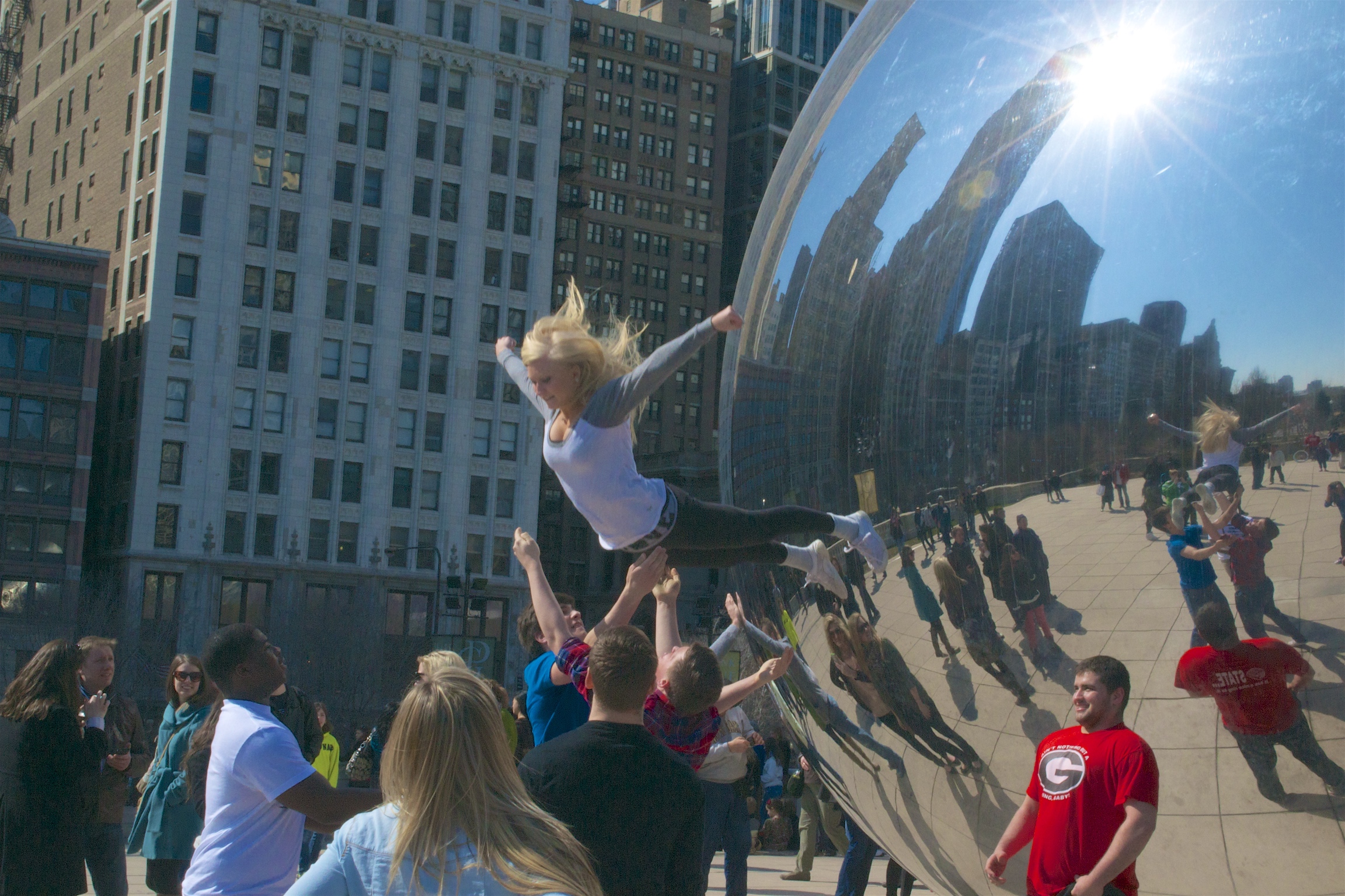 When assembling images for our show, “Moments and Souls” I forgot to include this one. If we ever decide to publish a book I will have to include it. It is a perfect moment captured in front of the Cloud Gate sculpture in Chicago’s Millennium Park. The sculpture is affectionately called The Bean by Second City residents.