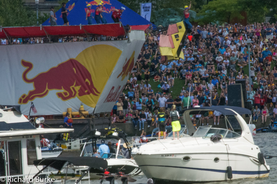 It is an event event organized by Red Bull in which competitors attempt to fly home-made, human-powered flying machines. They are size-limited to around 133 feet and weight-limited to approximately 330 lb. A team of four pushes the pilot and vessel off a pier and in Pittsburgh over the Allegheny River. Well actually into the river because most of these flying machines rarely fly at all.