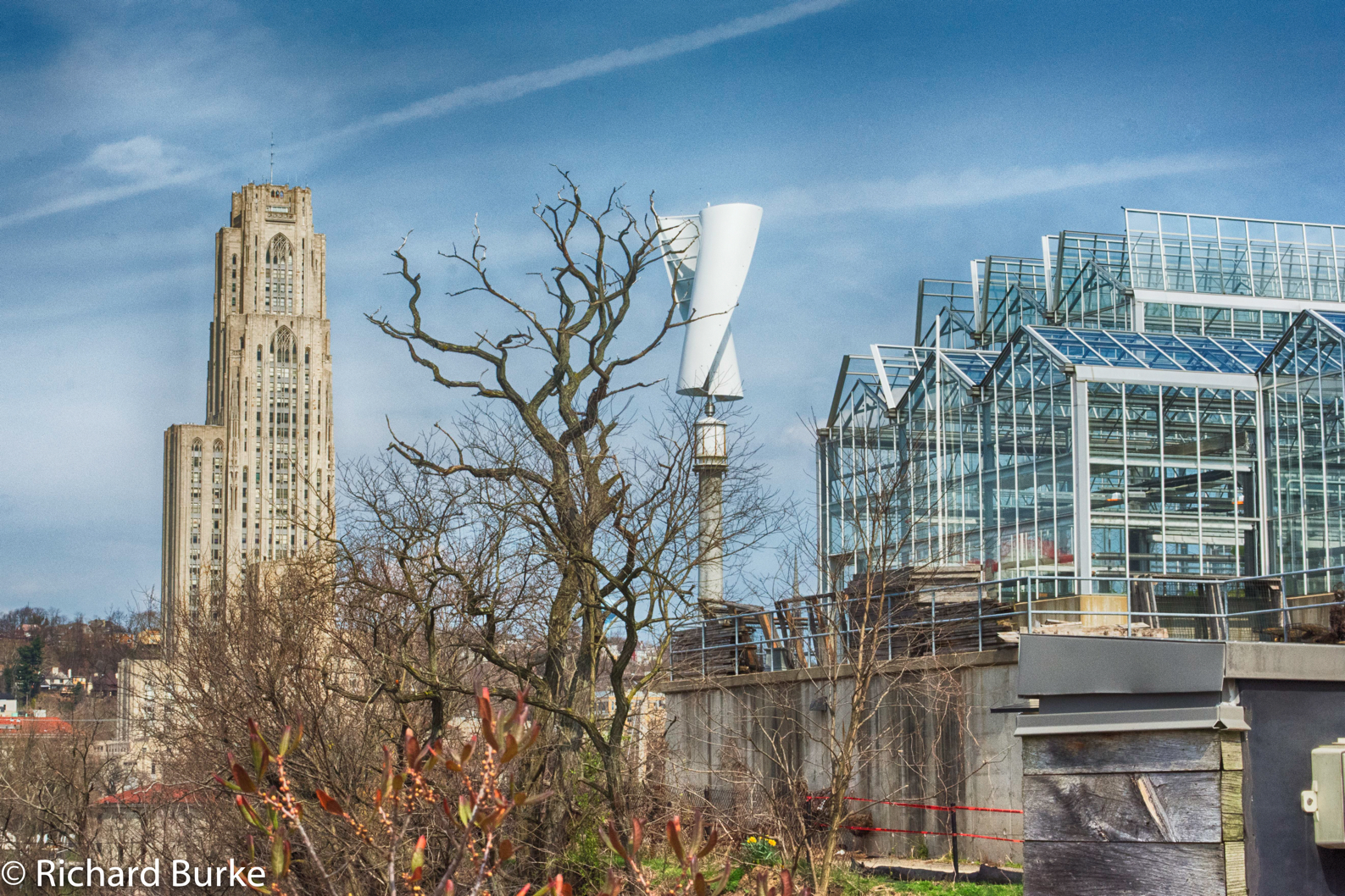 The Phipps Conservatory has a sophisticated power system using solar, passive solar, hydroelectric and wind to power their state of the art Conservatory. This view is from the roof area adjacent to the solar farm and shows their new wind turbine. In the back is the beautiful Gothic Cathedral of Learning of the University of Pittsburgh.